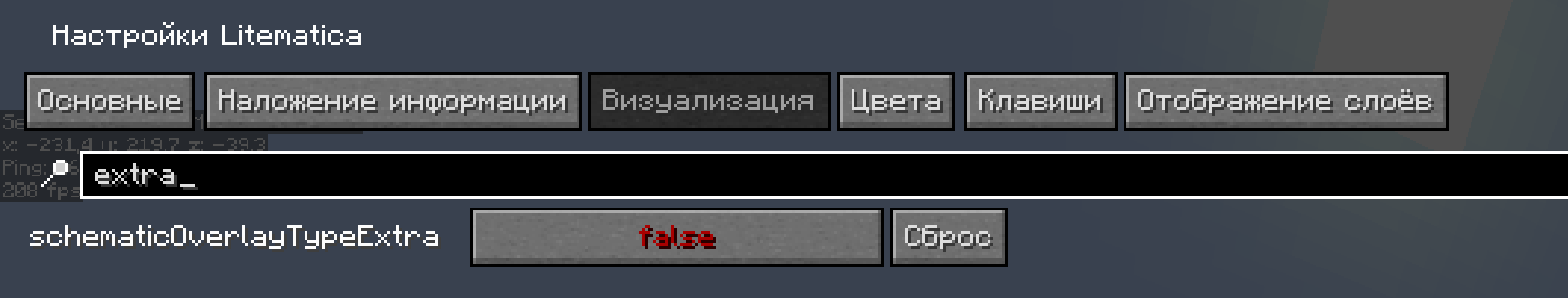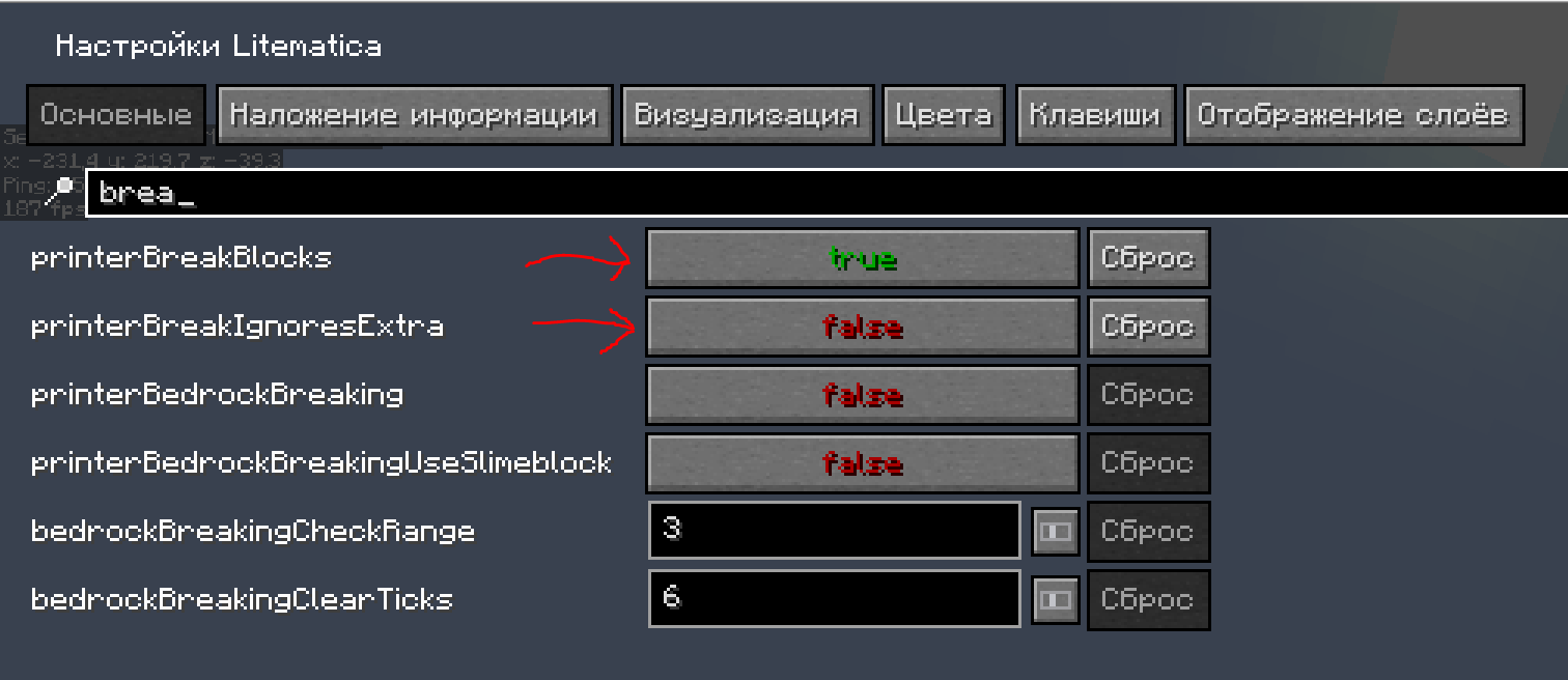 После того как вы ее выделили - можем приступать к настройкам в лайтматике. Нажмите M+C, чтобы сразу открыть настройки. Во вкладке "Основные", найдите две функции "printerBreakBlocks" и "printerBreakIgnoresExtra"