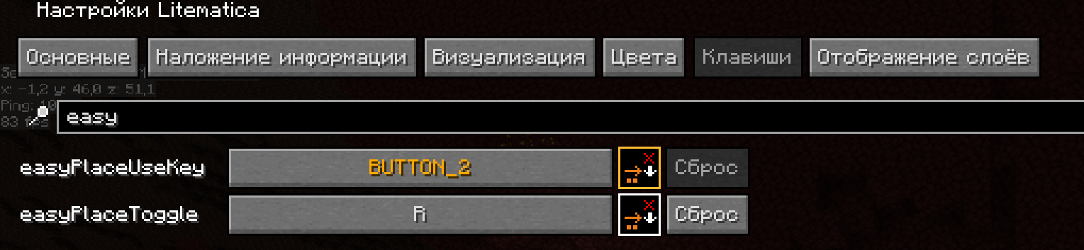 Перейдите в вкладку "Клавиши" и забиндите "easyPlaceToggle" на удобную вам клавишу